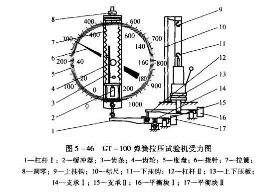 机械式弹簧拉压试验机主要有两种结构:a)量程可切换的拉压试验机 以GT-100型为例,主要由试样夹持机构,加荷机构,变形计量装置和测力机构组成。机座右边装有试样夹持,加荷及变形计量机构。左边装有弹簧式测力机构及度盘。机座内装有传递杠杆及负荷变换机构。机座支持在四个可调螺钉上,可调节机体水平度,如图:
