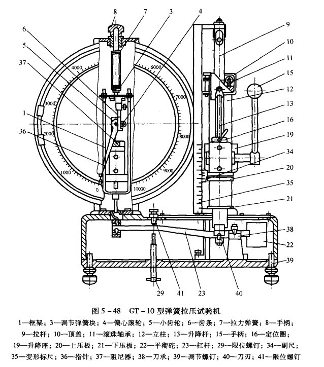 弹簧拉压试验机常见的一些故障介绍和排除办法。1.(1)变换负荷时指针不对零点,超过三分格以上者。产生原因是平衡砣22位置不正常,正常使用0~200N度盘时,平衡砣由支架托着,与杠杆30分离。使用0~100N度盘时,它落在杠杆30V形槽内,并与支架脱开。(2)平衡锤28重量不合要去,加配重铅块失落等(3)拉力弹簧7两端的钩框跳出定位孔。排除方法(1)检查位置是否正常,应酌情调整(2)应从新配上(3)将框钩复位