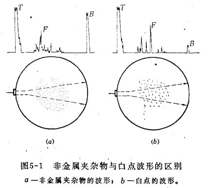 锻件中常见的缺陷有偏折、疏松、非金属夹杂物、气夹、白点、缩孔、裂纹等。白点及裂纹是危险性缺陷。白点与非金属夹杂物的波形如下图,探测时应注意区别。