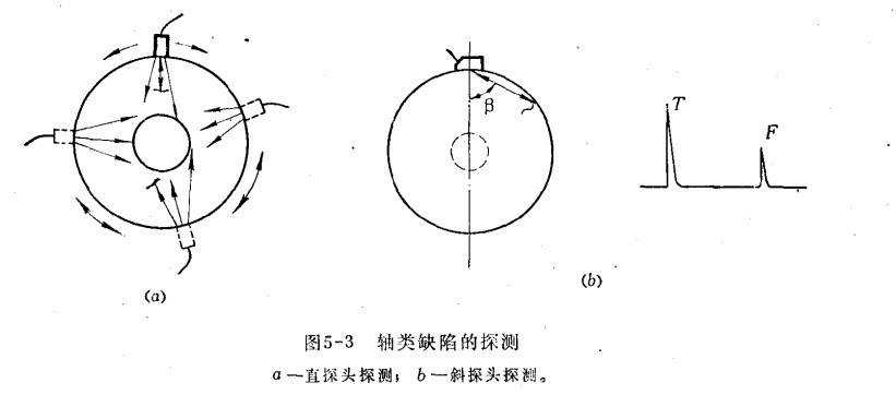 三、大型锻件的探伤 (1)轴类锻件的探伤 轴类锻件如发动机主轴,汽轮机及发电机的转子轴以及柴油机曲轴等,在运转时,转速很高,承受中、高载荷,为了保证轴类锻件能正常工作,必须使用超声波探伤仪探测其缺陷。探测方法一般用脉冲发射法,频率通常用2.5兆赫。用直探头在轴的周围上探测时,利用直探头的中心声束来发现与轴径向中心线垂直或接近垂直的缺陷,并依靠探头的扩散声束来发现与轴径向中心线平行或接近平行的缺陷,如下图所示a,用斜探头沿轴的圆周方向探测时,可有效的发现径向缺陷,特别是近于轴表面的裂纹,如图b所示。横向缺陷,可用直探头在轴的两端探测,但有的缺陷处于圆角近表面或缺陷较小距离又远,而用直探头探测难以发现时,可用斜探头沿轴的长度方向探测,如图2。