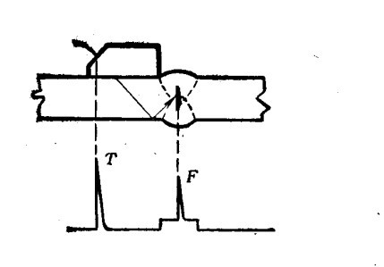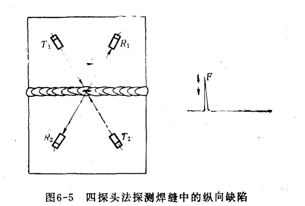 (二)四探头法 四探头法可探测厚度为4~12毫米的薄板对接焊缝中的裂纹、未焊透、条状夹渣等缺陷。而且还可以进行探伤仪自动探测。四探头法为两组探头(T为发射探头,R为接收探头),用机械固定并分别放在焊缝两侧(距焊缝轴线距离相等),探伤时沿焊缝同时移动。探测纵向缺陷时,T1R1为一组探头,T2R2为一组当焊缝中无缺陷时,荧光屏上只出现焊角反射波。如有缺陷,则在焊角反射波之前出现缺陷波F(如缺陷在焊缝中间,则两组探头所得缺陷波重叠在一起),探头移动时,缺陷波的幅度改变。