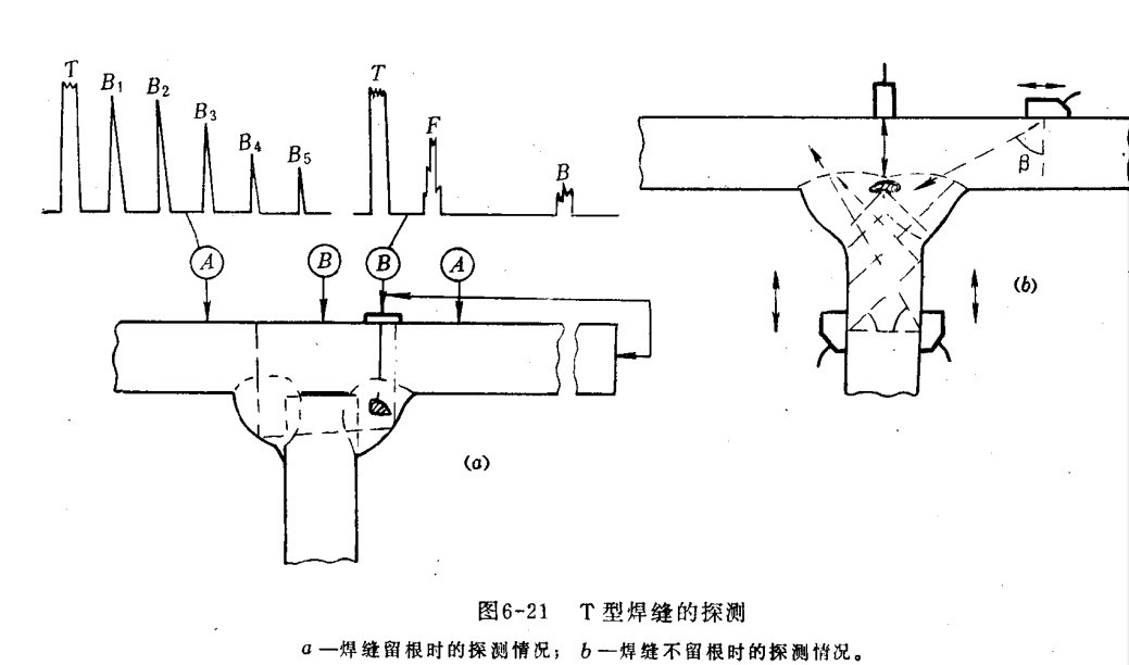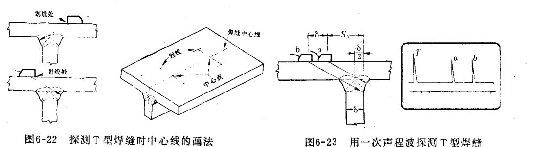 一、T型焊缝探伤 T型焊缝探伤有两种形式:其一为面板与腹板链接处的中间部分不需要焊透,只在两角处焊接。其二为面板与腹板连接处全部焊透,这两种焊缝分别可用直探头及斜探头探伤。