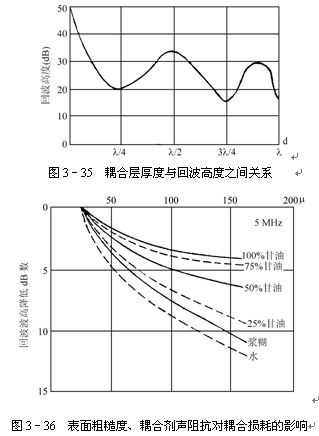 除耦合剂材料性质外,耦合损耗与耦合层厚度d及耦合层中超声波波长l有关。直接接触法超声波探伤的耦合层厚度一般均较薄,d<l/4。图3–35为2.25MHz直探头用锭子油作耦合剂时测得耦合层厚度与回波高度之间关系曲线(不同耦合条件所得曲线形状类同)
