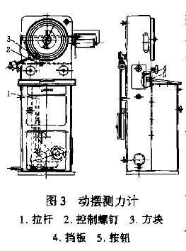 如图3.可调整测力计横隔板上的控制螺钉2,调整到指针能转一周稍超过2~3格,此时要注意拉杆1上的挡板4先触动按钮5,然后方块3再相继有控制螺丝2接触,如果不注意这种情况会使机器发生意外损坏。