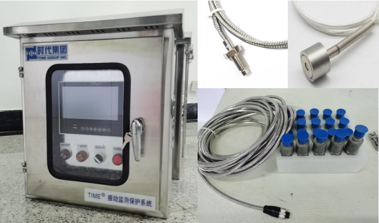 7218振动监测保护系统由人机界面(触摸屏)、振动传感器、温度传感器、电控箱等部分组成,主要用于对分旋转机械的振动烈度进行长期监测,该系统能够实时测量被测位置的振动速度值有效值和表面温度,并在人机界面上同时直观显示;同时具有标准的电流输出,可与各种