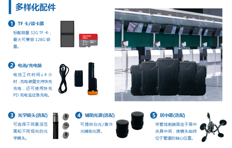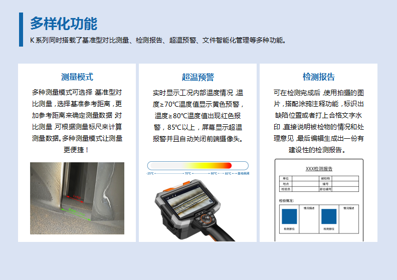 5.7英寸高清智能触摸屏,触控灵敏操作精准;200万/100万超高清像素,画质超清晰,真实还原图像效果;多种图片特效,提高图片对比度,搭配自动缺陷识别框选,更快更精准的发现被检物缺陷。