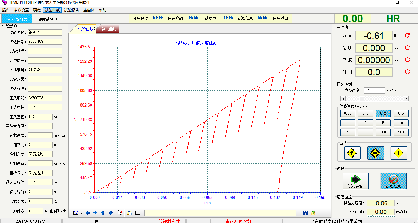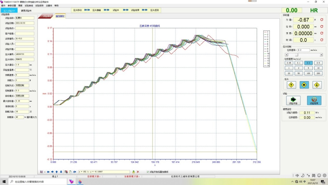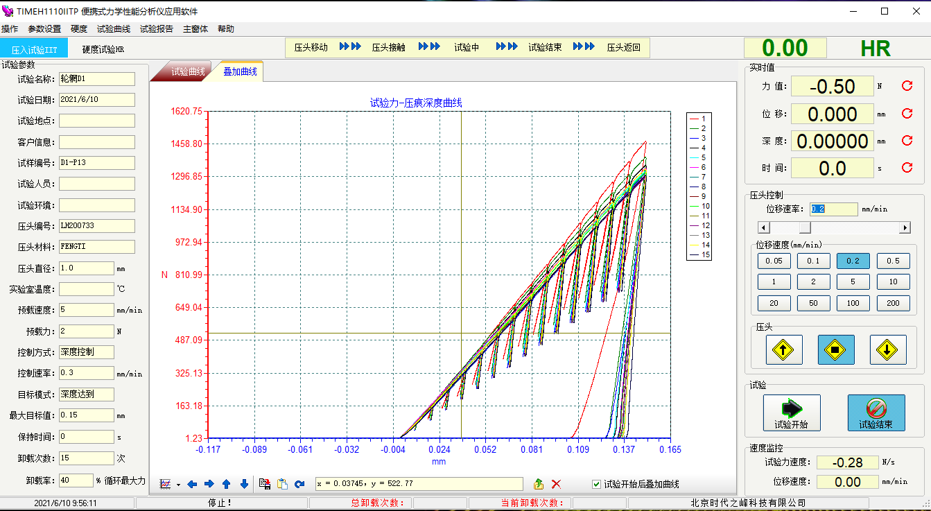软件提供的试验曲线种类丰富,且可随时在各曲线类型之间进行切换观察。曲线类型有:试验力-时间曲线、试验力-压痕深度曲线、压痕深度-时间曲线等。