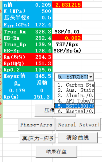 软件还集成了在国内应用较广的布氏硬度-强度半经验转换器,通过全局迭代自逼近后的加工硬化指数(n值)估测材料屈强比以及强度值。