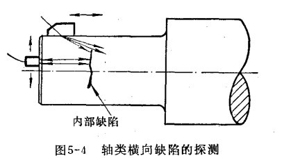 三、大型锻件的探伤 (1)轴类锻件的探伤 轴类锻件如发动机主轴,汽轮机及发电机的转子轴以及柴油机曲轴等,在运转时,转速很高,承受中、高载荷,为了保证轴类锻件能正常工作,必须使用超声波探伤仪探测其缺陷。探测方法一般用脉冲发射法,频率通常用2.5兆赫。用直探头在轴的周围上探测时,利用直探头的中心声束来发现与轴径向中心线垂直或接近垂直的缺陷,并依靠探头的扩散声束来发现与轴径向中心线平行或接近平行的缺陷,如下图所示a,用斜探头沿轴的圆周方向探测时,可有效的发现径向缺陷,特别是近于轴表面的裂纹,如图b所示。横向缺陷,可用直探头在轴的两端探测,但有的缺陷处于圆角近表面或缺陷较小距离又远,而用直探头探测难以发现时,可用斜探头沿轴的长度方向探测,如图2。