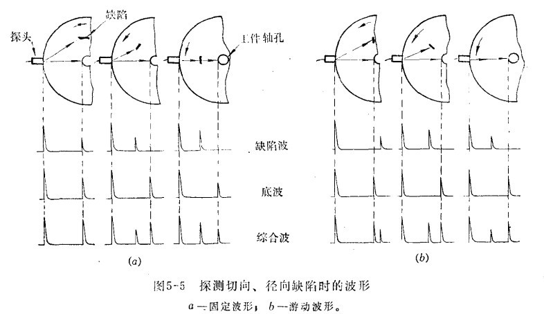 1.转子轴的探测 转子轴一般应在锻坯经粗加工后,即进行全面探测,否则成品形状复杂不易探测。转自轴以一定的转速旋转,即可做轴向连续探测。这时要区别固定波形和游动波形,即注意观察缺陷波在荧光屏时间轴上的游动和幅度变化情况。当缺陷面积较大又处于轴中心孔附近时,容易产生游动波形,即探头相对沿轴的圆周方向移动时,缺陷波在底波(中心孔反射波)前后游动且幅度变化。一般地说,切向缺陷的反射波是不游动的,称固定波形,将向缺陷的反射波是游动的,称游动波形。当探头在有切向缺陷的转子轴的圆周上相对移动时,荧光屏上可获得位置较固定的缺陷波,缺陷波只在底波之前移动,其移动范围甚小,只有一个波幅最高值,在最高值后波幅逐渐降低,直至消失。如下图a所示,当探头在有径向缺陷的转子轴的圆周上相对移动时,缺陷波在底波前后游动范围较大,在底波之前和之后都有消失点,并有2个波幅最高值(二个最高值出现在荧光屏的同一位置上)如下图b所示,探测时也可用直探头和斜探头同时测试。
