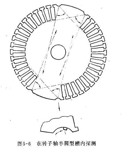 对安装完毕的电机转子轴而言,因形状复杂,若用通用的方法探测,则使探测范围受到限制,有些区域内的缺陷不能发现,因而可在电机转子的大齿面上开四个半圆形的槽,将具有相应曲率的探头放在此槽内摆动,使声束能扫查到所有截面,这样,能探测到大部分区域,如下图。