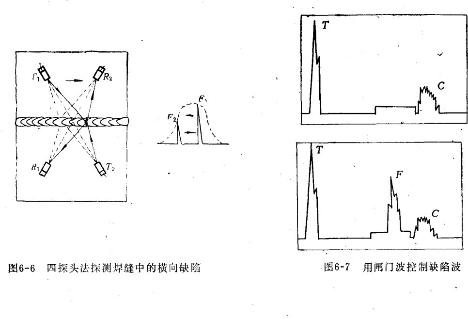 (二)四探头法 四探头法可探测厚度为4~12毫米的薄板对接焊缝中的裂纹、未焊透、条状夹渣等缺陷。而且还可以进行探伤仪自动探测。四探头法为两组探头(T为发射探头,R为接收探头),用机械固定并分别放在焊缝两侧(距焊缝轴线距离相等),探伤时沿焊缝同时移动。探测纵向缺陷时,T1R1为一组探头,T2R2为一组当焊缝中无缺陷时,荧光屏上只出现焊角反射波。如有缺陷,则在焊角反射波之前出现缺陷波F(如缺陷在焊缝中间,则两组探头所得缺陷波重叠在一起),探头移动时,缺陷波的幅度改变。