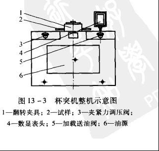 (2)试验机解析 a)整机结构 试验机主机采用箱体式结构形式,复合油缸安装在箱体里的上部,下部为油源部分。试验机驱动方式为:人工控制,液压夹紧,液压加荷,光栅尺测量位移,油压传感器测夹紧力和冲压力,数码显示。整个系统合于一体,结构紧凑,安装方便,测试精度高。 b)工作原理 1)液压系统与操作:该试验机为液压夹紧、液压加载。