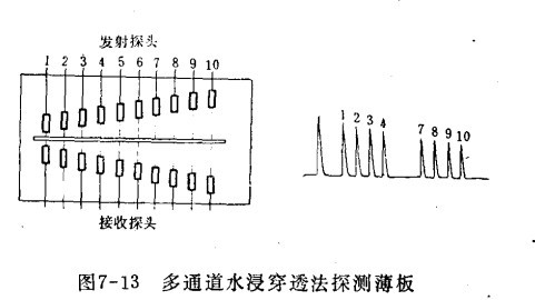 此方法是将薄板置于水槽中,发射与接收探头分别置于薄板的两向对面。当无缺陷时,发射声波经水层、薄板到达接收探头,在荧光屏上出现直通波,如有小缺陷时,直通波降低,如缺陷面积大于声束截面积时,直通波消失。