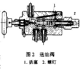 (2)送油阀内有杂质。当不干净的东西如铁沫、油渣等随油带到送油阀(如图二)的内部时,易使活塞受损,同时对指针平稳上升亦有影响,要取出这些不清洁的东西,可拧下螺钉2用小丝杆从后面拧在活塞1上把它拉出来,用油清洗阀体内孔、活塞,然后重新装上活塞及螺钉2,装螺钉2时质疑内部必须灌油再拧上,使内部不存有空气,否则会影响油阀正常使用。