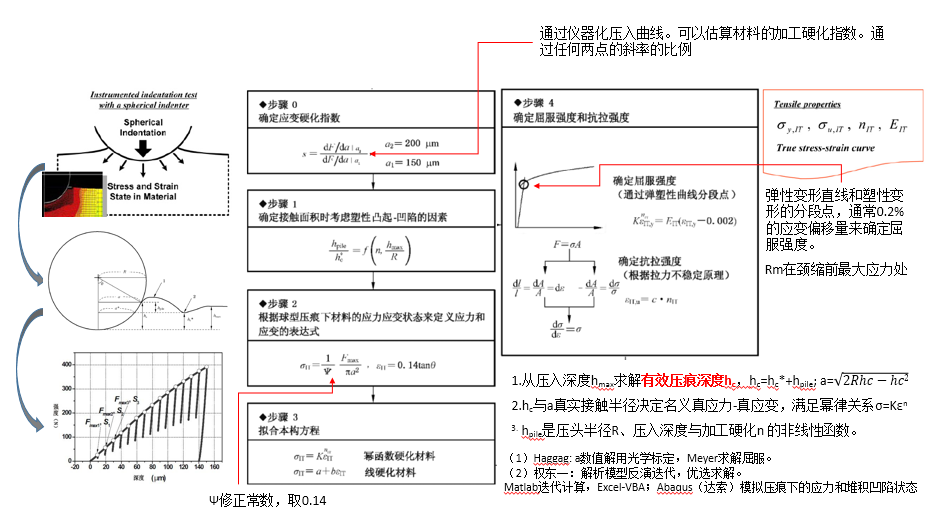 仪器 化压入 通过在材料同一个位置连续加载 / 卸载测量出的载荷和深度,绘制成载荷-深度曲线。真应力值和真应变值通过数学理论公式由载荷和深度计算而来。压头在下压的过程中材料会在压痕区域产生弹塑性变形。屈服强度可以从应力-应变曲线上弹性线与塑性曲线的交点计算得出,抗拉强度利用张力不稳定的理论计算得出。
