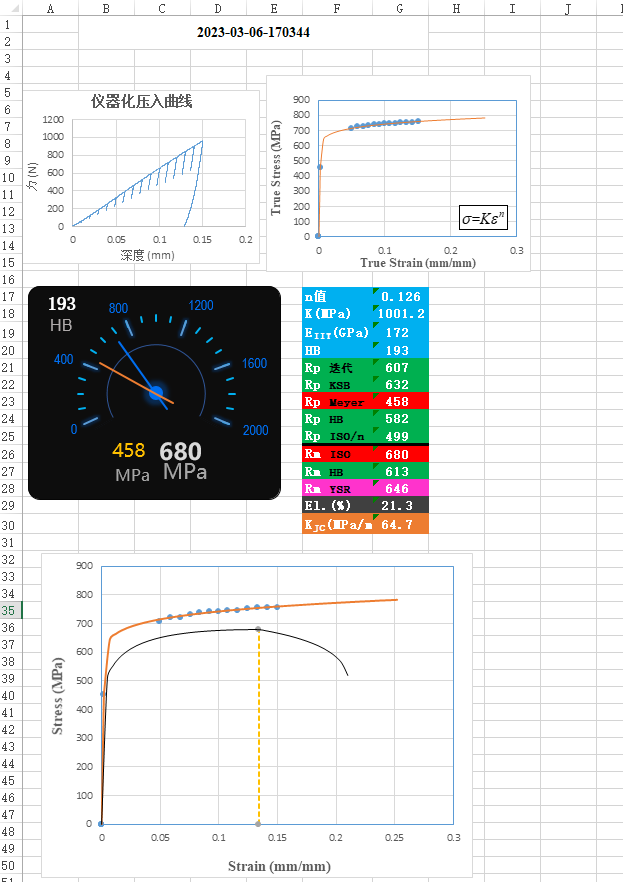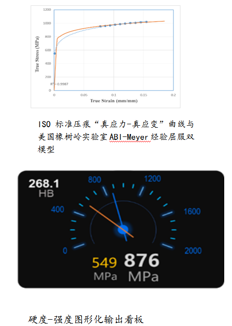 软件还集成了在国内应用较广的布氏硬度-强度半经验转换器,通过全局迭代自逼近后的加工硬化指数(n值)估测材料屈强比以及强度值。