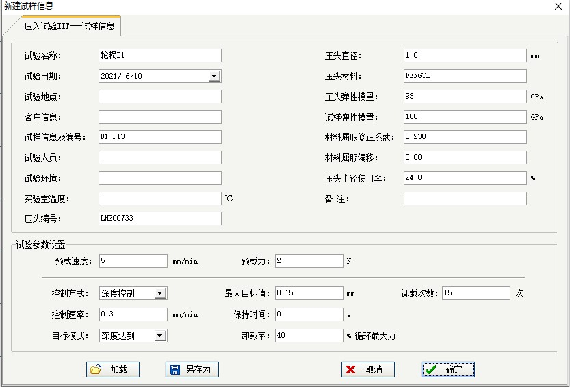 按流程化试验模板,用户选择新建试样信息模块,第一步输入压入试验IIT-新建试验信息;第二步设置各循环周期的统一目标值:如最大力、最大深度、循环次数、力控速率、深度控制速率、卸载率等指标;第三步启动试验;第四步试验数据自动保存。