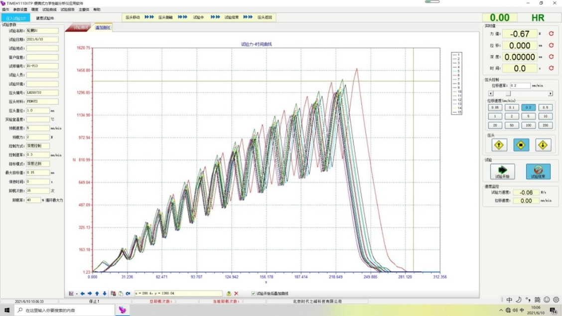 软件提供的试验曲线种类丰富,且可随时在各曲线类型之间进行切换观察。曲线类型有:试验力-时间曲线、试验力-压痕深度曲线、压痕深度-时间曲线等。
